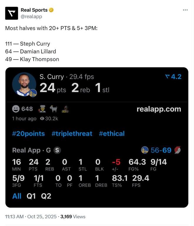 据统计,这是库里生涯第111次半场砍下至少20分+5三分,历史最多!第二名利拉德64次,第三名克莱49次。