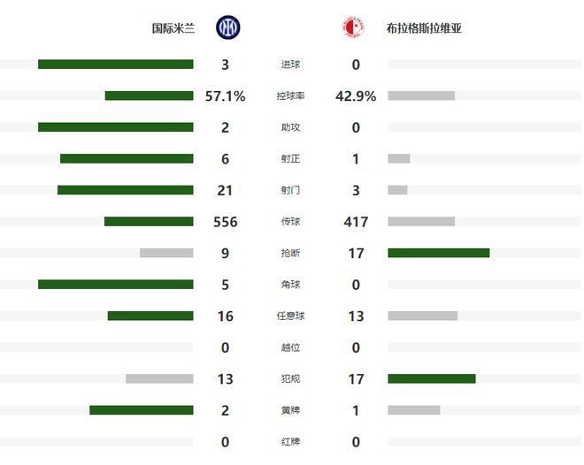 由于本周末国米还要在意甲联赛第六轮,坐镇主场梅阿查球场迎战克雷莫内塞,因此在胜局已定的情况下,他们也没有继续猛攻,而是以控制为主,成功在主场零封了布拉格斯拉维亚全取三分,并且将自己各项赛事的连胜场次扩大到了4场。