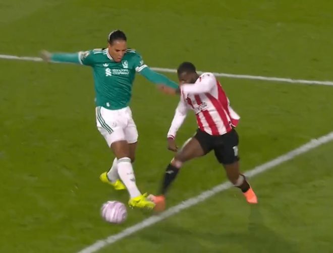 这个进球前发生了一连串混乱的事件。首先萨拉赫在左路对沙德犯规,随后达姆斯高拿到球并迫使马马尔达什维利做出扑救。布伦特福德将球发展到左路,瓦塔拉突破范戴克后被犯规,地点看似在禁区线外。